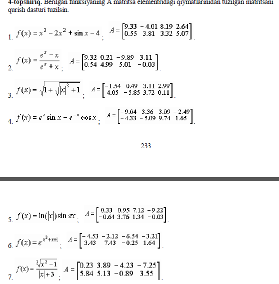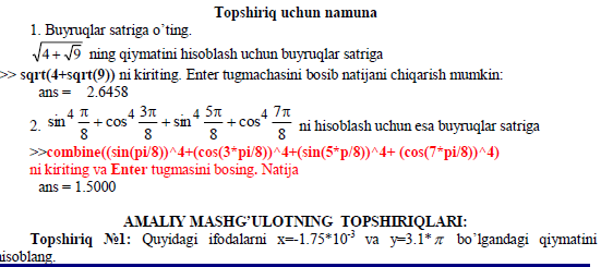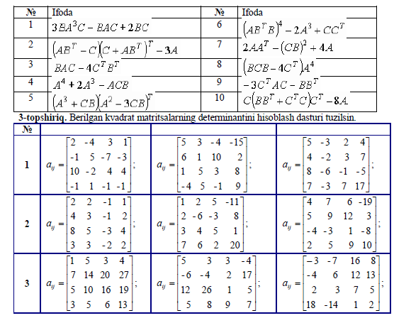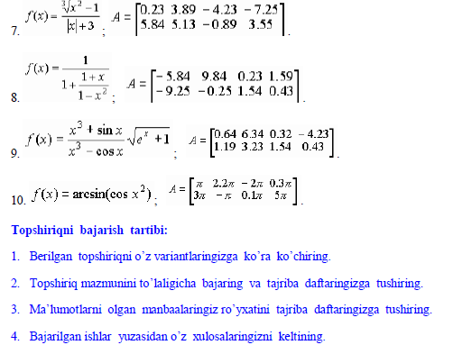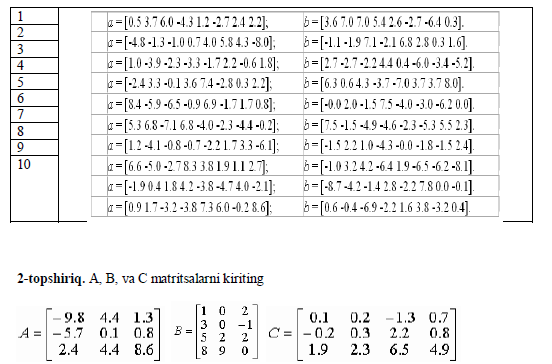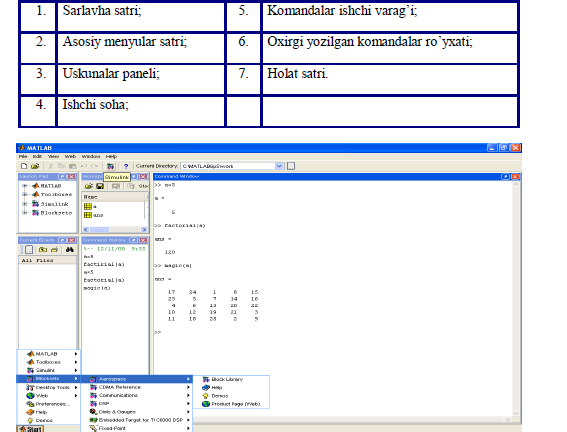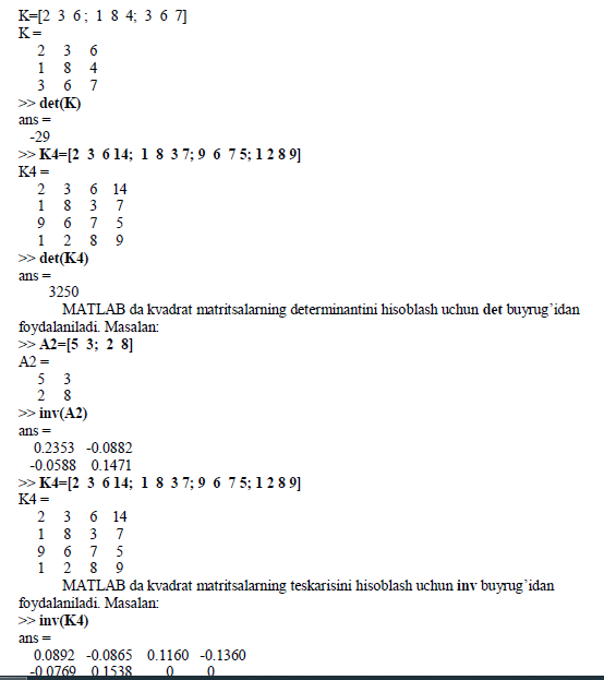 2. MATLAB oynasining asosiy elеmеntlarini tushuntiring? 3. MATLABning asosiy mеnyu bandlari vazifalari qanday? 4. MATLAB matritsa va vektorlar qanday kiritiladi. 5. MATLAB da massivlar uchun ishlatiladigan buyruqlarni sanang. 6. det, inv, rank buyruqlarining vazifalarini tushuntiring.