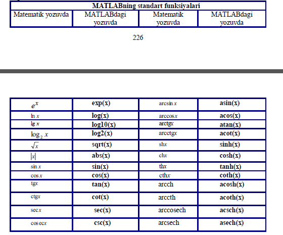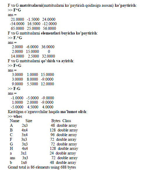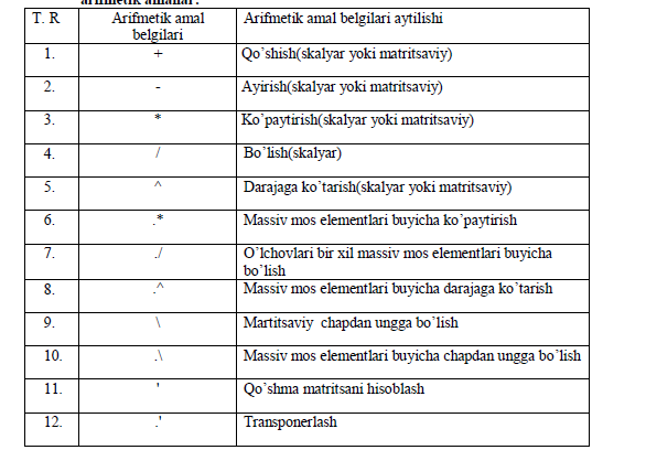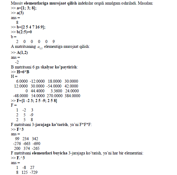 MATLAB da matematik ifodalar ma’lum bir bajarilish tartibiga asosan bajarililadi. Avval mantiqiy amallar, so’ngra arifmetik amallar: avval daraja, keyin ko’paytirish va bo’lish, undan keyin esa qo’shish va ayirish bajariladi. Agar ifodada qavslar bo’lsa, avval qavs ichidagi ifoda yuqoridagi tartibda bajariladi. Matritsalar ustida amallar bajarishda avval transponerlash, keyin darajaga ko’tarish, keyin ko’paytirish, keyin qo’shish va ayirish tartibi amal qiladi. MATLAB da massivlarning ustun-vektor, qator-vektor va matritsa ko’rinishlaridan foydalaniladi. Massivlar kvadrat qavslarga olinib yoziladi. Ustun-vektorning har bir elementi, ya’ni har bir qatori nuqtali vergul bilan ajratiladi.