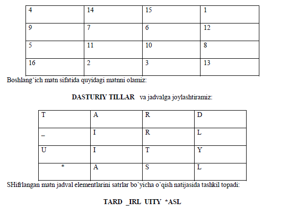 Endi shifrlangan matn qatorlar bo’yicha aniqlanadi, ya’ni o’zimiz uchun 4 tadan belgilarni ajratib yozamiz.