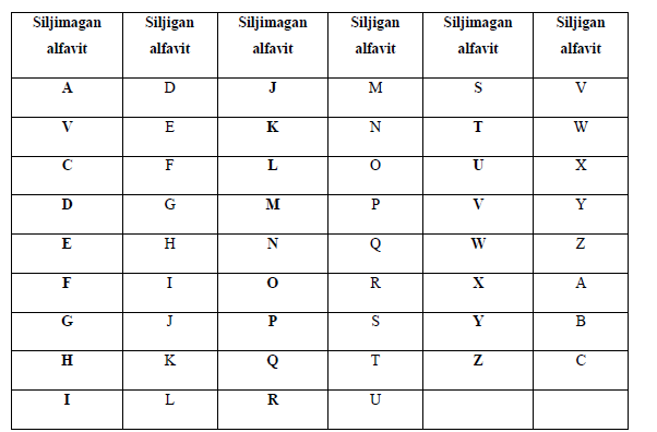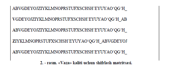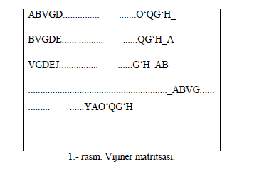 • Sezar usuli; • Affin tizimidagi Sezar usuli; Vijinerning shifrlash tizimi. Birinchi bo‘lib Vijiner tizimi 1586-yilda chop etilgan va u ko‘p alfavitli tizimga nisbatan yuqoriroq o‘rinda turadi. Bleza Vijinera o‘zini XVI asrning fransuz diplomati deb hisoblaydi. U kriptografiya tizimiga, ya’ni uning rivojlanishiga o‘z hissasini qo‘shgan. Vijiner tizimi Sezar shifrlash tizimiga qaraganda mukammalroq hisoblanib, unda kalit harfidan harfga almashtiriladi. Bunday ko‘p alfavitli almashtirish shifrini shifrlash jadvali orqali ifodalash mumkin. Quyidagi birinchi jadvalda Vijinerning ingliz alfaviti uchun mos keluvchi jadval ko‘rsatilgan. Bu jadvaldan matnni shifrlash va uni ochish uchun ishlatiladi. Jadvalning ikkita kirishi bo‘lib: YUqori qatordagi harflardan kiruvchi ochiq yozuv uchun foydalaniladi. CHap ustundan esa kalit harflaridan foydaniladi. Misol uchun kalit ketma-ketligini r-deb olaylik, u holda kalit r-alfavitli r-satrdan iborat bo‘ladi. π=(π0, π1,…,πr-1); Vijinerning shifrlash tizimida ochiq matn x=(x0,x1,…,xn-1) va shifrlangann matn y=(y0,y1,…,yn-1) ko‘rinishga ega. π=(π0, π1,…,πr-1) kalit yordamida quyidagicha munosabatda bo‘ladi. x=(x0,x1,…,xn-1) y= (y0,y1,…,yn-1); (y0,y1,…,yn-1)=(π0(x0),π1(x1),…,πn-1(xn-1)); YUqoridagi ifodadan ma’lumki Vijiner jadvali orqali shifrlashda matnning (axborotning) har bir harfiga mos keluvchi kalitning har bir harfi orqali ularning ustun va satrlari kesishmasiga mos keluvchi harflar olinadi. Agar o‘zbek alfaviti ishlatilsa, Vijiner matritsasi [36x36] o‘lchamga ega bo‘ladi (1. -rasm).