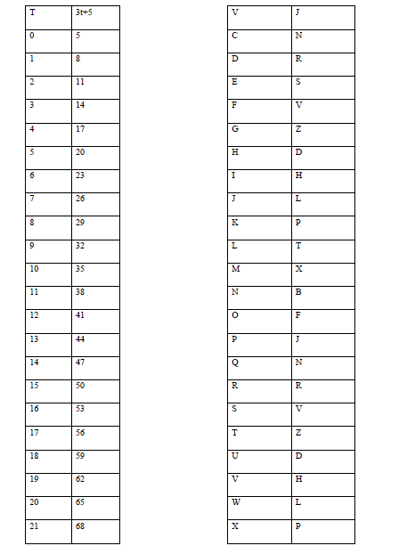 m=26, a=3, b=5 bo‘lganda quyidagi jadval hosil qilinadi: SHunga mos ravishda harflar quyidagicha almashadi: