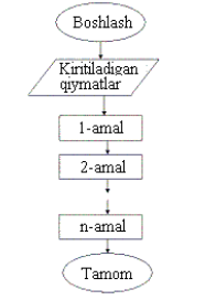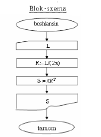 • chiziqli algoritmlar; • tarmoqlanuvchi algoritmlar; • takrorlanuvchi yoki siklik algoritmlar;2-rasm. Chiziqli algoritmlar blok - sxemasining umumiy strukturasi Misol uchun : Uzunligi L bŏlgan aylana Bilan chegaralangan doira yuzini toping