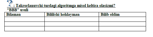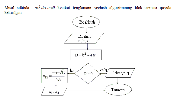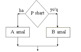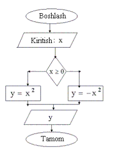 Berilgan shart romb orqali ifodalanadi, r-berilgan shart. Agar shart bajarilsa, "ha" tarmoq bo‘yicha a amal, shart bajarilmasa "yo‘q" tarmoq bo‘yicha b amal bajariladi. Tarmoqlanuvchi algoritmga tipik misol sifatida quyidagi sodda misolni qaraylik. Misol: − = x agar x 0 x agar x 0 Y 2 2 Berilgan x ning qiytmatiga bog‘liq holda, agar u musbat bo‘lsa «ha» tarmoq bo‘yicha yqx2 funksiyaning qiymati, aks holda y=-x2 funksiyaning qiymati hisoblanadi.