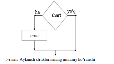 Ko‘pgina masalalarni yechishda, shart asosida tarmoqlanuvchi algoritmlarning ikkita tarmog‘idan bittasining, ya’ni yoki «ha» yoki «yo‘q» ning bajarilishi yetarli bo‘ladi. Bu holat tarmoqlanuvchi algoritmning xususiy holi sifatida aylanish strukturasi deb atash mumkin. Aylanish strukturasi quyidagi ko‘rinishga ega: