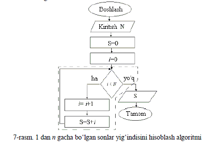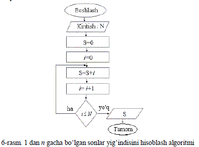 Yuqorida keltirilgan algoritm va blok sxemadan ko‘rinib turibdiki amallar ketma-ketligining ma’lum qismi parametr i ga nisbatan N marta takrorlanayapti. Yuqorida ko‘rilgan yig‘indi blok sxemalaridagi takrorlanuvchi qismlariga (aylana ichiga olingan) quyidagi sharti keyin berilgan siklik struktura mos kelishini ko‘rish mumkin. Yuqoridagi blok sxemalarda shartni oldin tekshiriladigan holatda chizish mumkin edi. Masalan, yig‘indining algoritmini qaraylik. Bu blok sxemaning takrorlanuvchi qismiga quyidagi, sharti oldin berilgan siklik strukturaning mos kelishini ko‘rish mumkin.