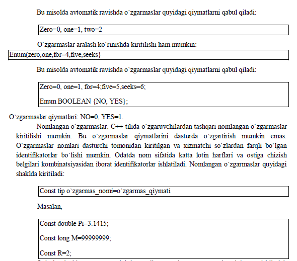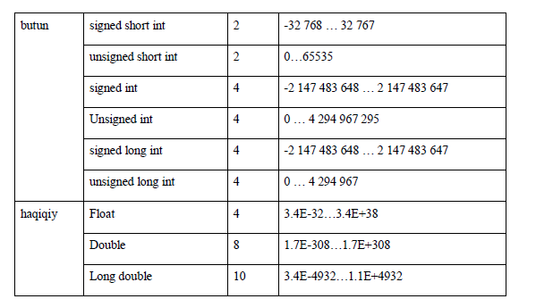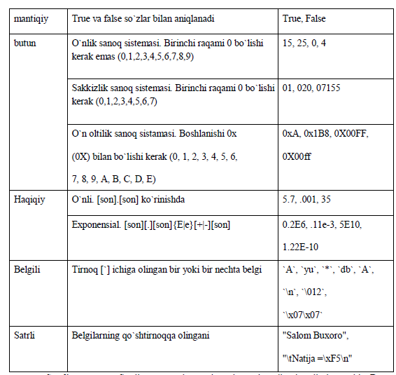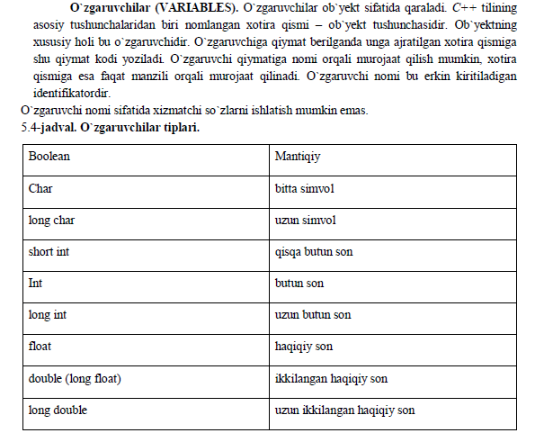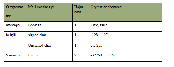 O`zgarmaslar. C++ tilida o`zgarmaslar o`zgarmas kattalikdir. Ularning mantiqiy, butun, haqiqiy, belgili, satrli o`zgarmaslarga bo`linadi. Dasturchi C++ tilida o`zgarmaslarni aniq ifodalay olishi kerak. 5.2-jadval. O`zgarmaslar formati