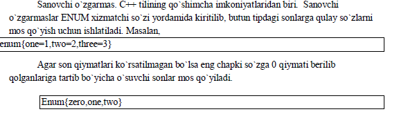 Satrli o`zgarmas. Satrli o`zgarmaslar orasiga eskeyp simvollarni qo`llash mumkin. Bu simvollar oldiga [\] belgisi quyiladi. Masalan, ―\n Birinchi satr \n ikkinchi satr \n uchinchi satr‖. Satr simvollari xotirada ketma-ket joylashtiriladi va har bir satrli o`zgarmas oxiriga avtomatik ravishda kompilyator tomonidan `\0` simvoli qo`shiladi. Shunday satrning xotiradagi hajmi simvollar soni+1 baytga tengdir. Ketma-ket kelgan va bo`shliq, tabulyatsiya yoki satr oxiri belgisi bilan ajratilgan satrlar kompilyatsiya davrida bitta satrga aylantiriladi. Masalan, ―Salom‖ ―Buxoro ‖ satrlari bitta satr deb qaraladi. ―Salom Buxoro‖. Bu qoidaga bir necha qatorga yozilgan satrlar ham bo`ysunadi.