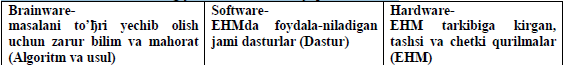 1. Informatika va axborot texnologiyalari fanining tarkibiy qismlari. Informatika va axborot texnologiyalari fani uch tarkibiy qismdan iborat:2. Masalalarni EHMda yechish bosqichlari. EHMdan foydalanib «ilmiy-texnik masalani yechish» tushunchasi keng ma'nodagi so’z bo’lib, quyidagi bosqichlarga bo’linadi. Maqsadimiz bosqichlarni saysi birlarini mutaxassis EHMdan foydalanmasdan va saysi birlarini EHMdan foydalanib bajarishini anislash, hamda bosqichlarni to’la o’rganib chiqishdan iborat. (Savol: Informatika fani qanday tarkibiy qismlardan iborat?) Ilmiy-texnik masalalarni EHMdan foydalanib yechish bosqichlari:
