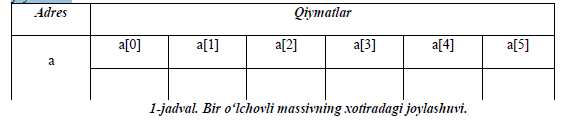 Massivning i-elementiga a[i] yoki *(a+i) – vositali murojaat qilish mumkin. Massiv uzunligi sizeof(a) amali orqali aniqlanadi. Massiv e’lonida uning elementlariga boshlang‘ich qiymatlar berish (initsializatsiyalash) mumkin va uning bir nechta variantlari mavjud. 1) O’lchami ko‘rsatilgan massiv elementlarini to‘liq initsializatsiyalash: int b[5]={8,5,-11,41,39}; Bunda 5 ta elementdan iborat bo‘lgan b nomli bir o‘lchovli massiv e’lon qilingan va uning barcha elementlariga boshlang‘ich qiymatlar berilgan. Bu e’lon quyidagi e’lon bilan ekvivalent: int b[5]; b[0]=8; b[1]=5; b[2]=-11; b[3]=41; b[4]=39; 2) O‘lchami ko‘rsatilgan massiv elementlarini to‘liqmas initsializatsiyalash: int b[5]={-11,5,29}; Bu yerda faqat massiv boshidagi uchta elementga boshlang‘ich qiymatlar berilgan. Shuni aytib o‘tish kerakki, massivni initsializatsiyalashda uning boshidagi ementlariga boshlang’ich qiymatlar bermasdan turib, oxiridagi elementlariga boshlang‘ich qiymatlar berish mumkin emas. Agarda massiv elementlariga boshlang‘ich qiymat berilmasa, unda kelishuv bo‘yicha static va