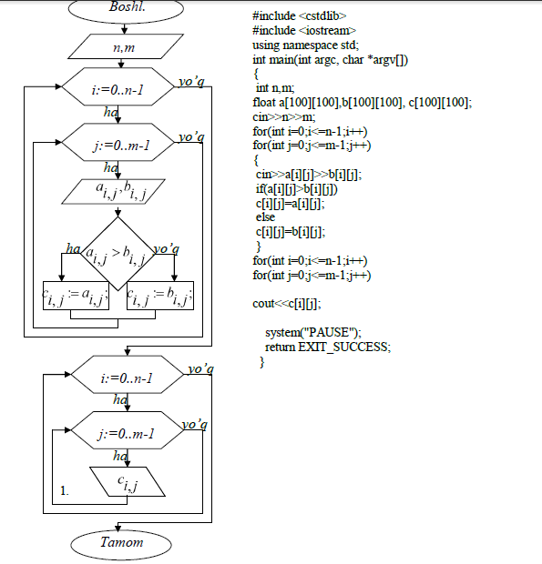 for (i=0;i Masala. O’lchamlari n×m bo’lgan (n>0,m>0) ikkita A va B matritsalar berilgan, ulardan