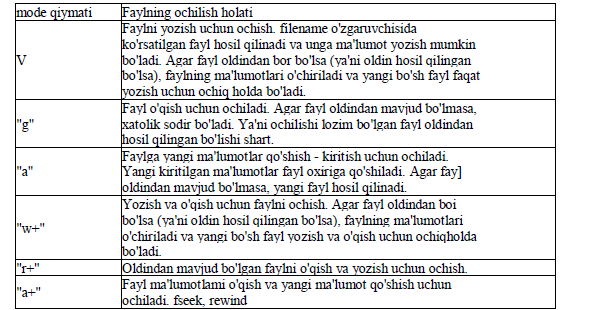 mode - o'zgaruvchisi ham char toifasidagi satr bo'lib, faylni qaysi holatda ochish lozimligini bildiradi.