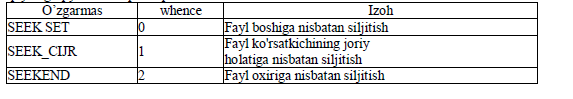 Bu fimksiya offset da ko'ratilgan bayt miqdoricha siljishni amalga oshiradi. Whence o'zgaruvchisi quyidagi qiymatlami qabul qilishi mumkin: