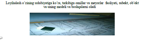 • faoliyat maqsadga yo’naltirilgan bo’lishi kerak; • faoliyat maqsadli bo’lishi kerak; • faoliyat asosli va samarali bo’lishi kerak; • optimal variantni izlashga asoslanishi kerak; Tarkibiy qismlar birligi: Har qanday ob’ekt tizim sifatida ko’rilishi kerak; soda qismlar tizim osti sifatida ko’rilishi kerak; Ishlangan ob’ekt odamlar uchun ko’rilishi bunyod qilinishi va ekspluatatsiya qilinishi kerak; Loyihalash tuzilishning asosiy bosqichlari tarkibiga: Tyexnik topshiriq (TT) — ishlanayotgan ob’ektning asosiy tavsiyalari belgilanadi, uning texnikva taktik-texnik tavsifnomasi, sifat ko’rsatkichlari va texnik-iqtisodiy talablar,bosqichlarda kerakli hujjatlarni ro’yxati, shuningdek buyimga mahsus talablar . Tyexnik taklif (TTF) — hujjatlar jamlanmasi, loyihani ishlashni texnik va texnik-iqtisodiy maqsadini asoslash yig’indisi (TIO). Bunday xulosa TT tahliliga asosan va turli variantlar echimi bo’lishi mumkin bo’lgan holda,ularning ishlov beriladigan va mavjud buyimlarni taqoslama bahosi, shuningdek patently materiallarga beriladi. Belgilangan tartibda kelishilgan va asoslangan eskiz loyiha ishlovi texnologik jarayonni(TJ) tasdiqlanganlari hisoblandi. Eskiz loyiha (EL) — omilli echimga ega bo’lgan va tuzilish bo’yicha umumiy holatni bayon qiladigan hujjatlar jamlanmasi va ob’ektda printsipli ishlar ishlovi, shuningdek uning vazifasini aniqlaydigan asosiy ko’rsatkichlar gabarit o’lcham to’g’risidagi ma’lumot. Tyexnik loyiha (TL) —oxirgi texnik qarorni qabul qaladigan, loyihalanadigan ob’ekt to’g’risida to’liq ma’lumot beradigan, ishchi hujjatlar ishlovining dastlabki ma’lumoti hujjatlari jamlanmasi. Ishchi loyiha bosqichi (IL) dastlabida tajriba ko’rinishga va uni sinovdan o’tkazishni to’liq hujjatlari ishlanadi Sinash bir qator bosqichlardan tashkil topadi (zavoddan to qabul –topshirishgacha), bularning natijasi bo’yicha loyiha hujjatlarga tuzatish kiritiladi. Bundan buyon belgilangan seriyani tayorlash uchun, uni sinash, buyimning asosiy tarkibiy qismlarini ishlab chiqarish jarayonini yoritish. Bu bosqich bo’yicha ham yana loyiha lariga tuzatish kiritiladi va bosh seriya(nazoratdagi)ni ishlab chiqish uchun ishchi hujjatlar ishlab chiqiladi.Hujjatlar asosida buyimlar ishlab chiqarishni oxirgi qayta ishlangan va tekshirilgan ishchi to’liq tyexnologik jarayonni yoritilgan hujjatlari tuziladi Sertifiqatsiya — Bosqich ishi davomiyligi tugallanadi,loyihalash faoliyatiga yakun yasaladi loyihalash hujjatlarini ishlash jarayoni echiladigan masalani murakkabligiga qarab bir qancha bosqichlarni birastirish mumkin. Texnik topshiriq va texnik loyiha birgalikda ilmiy tadqiqot ishlarit(ITI), tyexnik taklif va eskiz loyiha—tajriba –konstruktorlik ishi (TKI).Talabni predmetli til soxasiga keltiriladi, uni aniqlashtiriladi, uning kerakli echimlari asoslanadi Tyexnik topshiriq (TT), — birinchi va ishning majburiyatli bosqichi. Bajaruvchi buyritmachi bilan birgalikda bajaradi. Bu bosqich mashinasozlikda tashqi loyihalash deb ataladi. Bosqichning asosiy natijasi sifat ko’rsatkichlari tizimi hisoblanadi. Keyingi bosqichda ichki loyihalash paydo bo’ladi. Bu echim topishga qaratilgan va ishlovchi tomonidan bajariladi. Tasir omilini sintez qilish bosqichiga kiradi. Loyihalashni avtomatlashtirish deganda loyihani ishlab chiqish jarayonini bajarishning shunday usuli tushuniladiki, bunda loyihalash protseduralari va operatsiyalari loyihalovchining kompyuter texnologiyasi bilan chambarchas muloqotida amalga oshadi. Loyihalashni avtomatlashtirish hisoblash texnikasi vositalaridan muntazam ravishda foydalanishni nazarda tutadi; bunda loyihalovchi va kompyuter texnologiyasi orasidagi funktsiyalarni ratsional taqsimlash va masalalarni mashinada yechish metodlarini asosli tanlash lozim. Fan quydagi mutahasislik bilimlarini egallash imkonini berishi kerak: