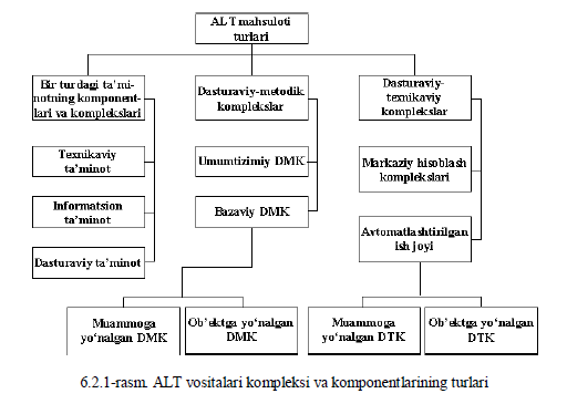 -CAD- buyimni avtomatlashtirilgan loyihasi; -CAM- Ishlab chiqarishni avtomatlashtirilgan texnologik tayorlash; -CARR- texnologik jarayonlarni avtomatlashtirilgan loyihasi; -CAAR- yig’ish jarayonlarini avtomatlashtirilgan loyihasi; -RDM- buyim haqida ma’lumotlarni loyihaviy boshqaruvi; Murakkab buyimlarni ichki loyihalashni ta’minlovchi zamonaviy ALIT(SAPR K)avtomatlashtirilgan loyiha ishlovlari tizimi (yoki CAD; CAE/CAM),kopchilik loyiha muolajalari, qolipli tuzilishga ega. Modullar o’zining joylashishga qarab , u yo bu masalani echishiga qarab farqlanadi. CAM tizimi TJ ning loyihalashning alohida masalalarini echishga, shuningdek CDBdastgoxi uchun dastur tayyorlash va boshqarishni ta’minlashga chaqirilgan. CAM modul tizimlari, CAD/CAM yoki CAE/CAD/CAM kopincha rivojlangan ALIT(CAPR) tarkibiga, asosan SDB dastgoxi uchun boshqaruvni tayyorlashni avtomatlashtirish kiradi TJni detal tayyorlashni loyihalash tizimlari CARR,yig’ishni–CAAR tizimlari. CAM, CARR, CAAR tizimlari CAPR TP ga kiradi. CARR va SAAR tizimlar integrallashgan SAPRga kirishi mumkin. masalan CAE/CAD/CAM/CARRtizim. Turli ahamiyatdaga mo’ljallangan SAPR muammolarni birgalikda faoliyat ko’rsatish uchun buyimlar loyiha ma’lumotlarini boshqarish uchun- RDM tizimi qo’llaniladi ICHTT ishlash asosi samarali avtomatlashgan ishlovi quydagi bazovoy omillar maqul bo’lishi kerak: -asosiy vazifani bajarishga va ICHTTasosiy masalalarini echishga kompleks yondoshish; -tizimni ochiqliligi, boshqa tizimlar bilan ishlab ciqiladigan tizimni BYAD avtomatlashtirilgan qo’llab quvvatlashda, CALS –standart orqali information birlashush; - tizim bir qator tizim ostilari ishtirokida tashkil qilinishi, ish umumiy tizimga bo’y sunishi kerak. Tizim osti bir-birlari bilan tas’irda bo’lishi, shuningdek ulardan birortasi boshqalardan ajralib ishlanmasligi kerak; - tizim rivojlanishga va samaradorlikni ko’tarishga, loyiha muddatini qisqartishga sifatni oshirish, mablag’ni tejashga, raqobatbardosh mahsulot yaratishga qaratilgan bo’lishi kerak.-CAE- avtomatlashtirilgan hisoblar va tahlil;